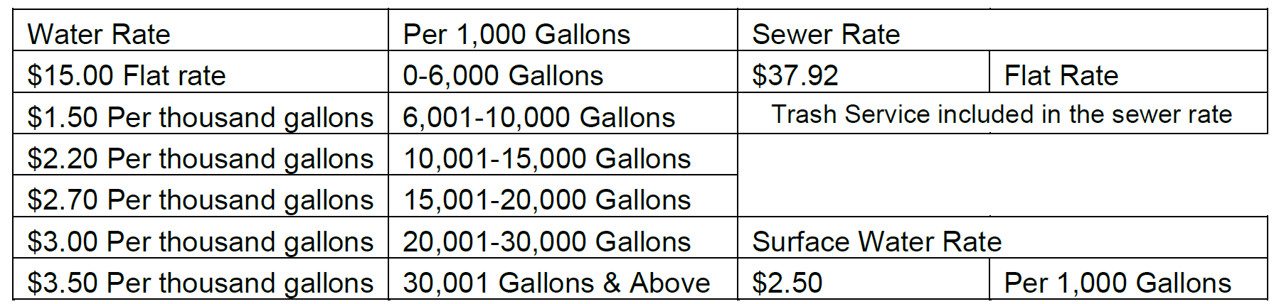 Water, Sewer and Surface Water is provided at the following rates (Subject to Change without Notice)